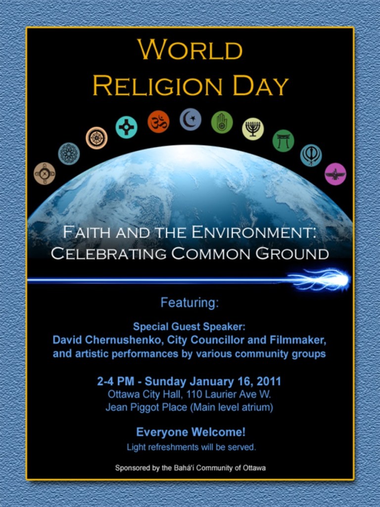 Over the past few weeks I have been working with a committee of the Baha’i Community of Ottawa to organize Ottawa’s World Religion Day celebration. World Religion Day is in Ottawa is normally themed around one of today’s major global challenges such as peace, the rights of the child and education. In the past the event has rarely dug very deep into these issues as it adheres to a strictly family-friendly format. This year we want dig a bit deeper while still being friendly to the families.