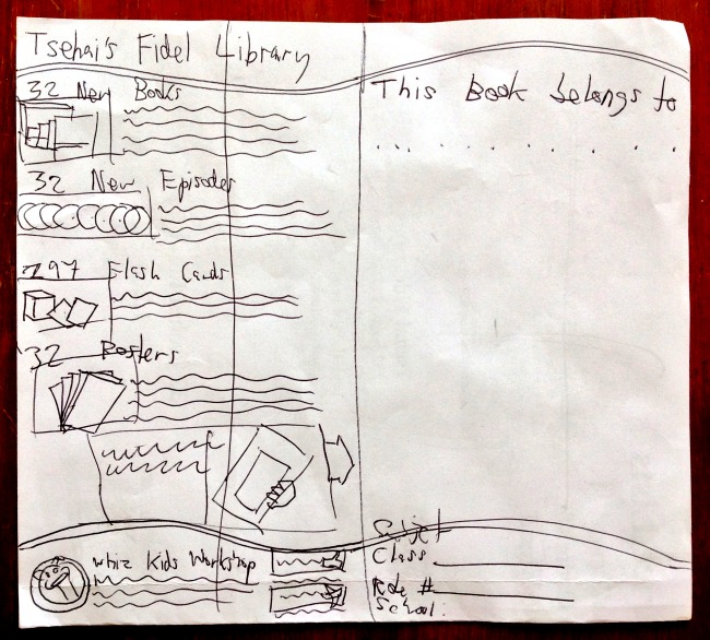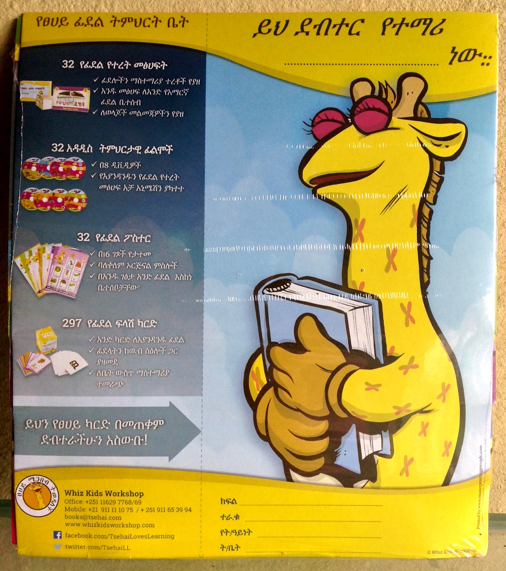 The left side promotes the other books, DVDs, posters and flashcards that make up the Tsehai’s Amharic Alphabet Library product line. Kids can write in their name and details on the left side and use it as a notebook cover that features the character Tsehai from the show.